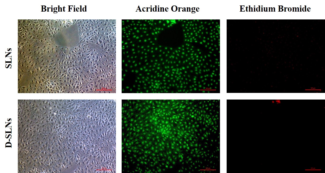 Visual determination of SLNs effect on cell morphology by acridine orange (AO)/ethidium bromide (EtBr) dual staining