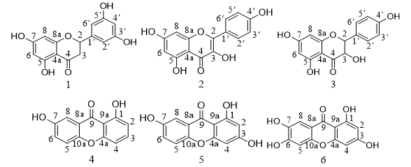 Having been dried and powdered, branches of G. schomburgkiana were macerated with acetone. The crude acetone extract, then, was subjected to a multi-step chromatographic purification to obtain (-)-5,7,3′,5′-tetrahydroxyflavanone (1) [6, 14], kaempferol (2) [15], (-)-dihydrokaempferol (3) [16], euxanthone (4) [17], gentisein (5) [18] and norathyriol (6) [19] (fig. 1). Characteristics of these chemical structures were interpreted through the analysis of the spectroscopic data (UV, IR, NMR and MS) and the comparison with the literature.