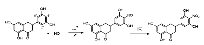 In this phytochemical investigation of branches of G. schomburgkiana, the compounds 1-6 were firstly isolated from this plant. In addition, compound 1 itself was a new natural constituent from the Garcinia genus. It might be useful as the chemotaxonomic marker of G. schomburgkiana. For the anti-radical activity, compound 6 showed the highest activity for DPPH, ABTS cation and hydroxyl radical scavenging, possibly as a result of the readiness of the ortho-dihydroxyl group (Ring B) of compound 6 to be promptly oxidized into the corresponding more stable ortho-quinone [20] (fig. 2). According to the Fenton’s reaction process, compound 6 was proposed to involve either in the reduction process of generated hydroxyl radical to become ortho-quinone [21] or directly in Fenton’s reaction in which 6-OH with 7-OH groups and 1-OH with 9-oxo groups chelated with iron (II) [22, 23] (fig. 3). While, compound 1 displayed the best activity for nitric oxide scavenging. The possible mechanism of compound 1 with nitric oxide was proposed through the nitration process at an electron rich position of an aromatic ring similar to that of tyrosine which was previously reported [24]. Consequently, compound 1, bearing 2 hydroxyl groups, would encourage the nitration at the C-4' position as shown in fig. 4.