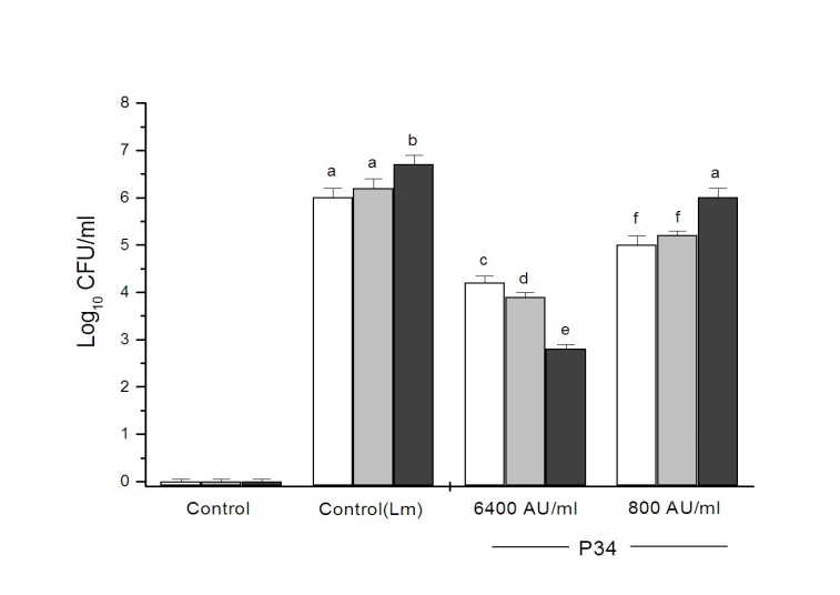 Fig. 1: Effect of peptide P34 on the growth of L. monocytogenes in Minas Frescal cheese. Cheese samples were treated with 10 mmol phosphate buffer pH 7.0 (control); inoculated with L. monocytogenes (control Lm), or treated with peptide P34 (6400 AU/ml or 800 AU/ml) and inoculated with L. monocytogenes. Samples were stored at 5 °C and analyzed at 0 (white bars), 96 (gray bars) and 168 h (black bars). Bars are the means±standard deviations of duplicates for two independent samples. Different letters indicate significant differences at p<0.05