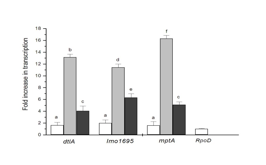 Fig. 2: Expression levels of dltA, Imo 1695 and mptA mRNAs in P34-treated L. monocytogenes growing on Minas Frescal cheese. Samples were analyzed at time zero (white bars), 96 (gray bars) and 168 h (black bars) after inoculation. All transcript levels were measured in duplicate for two independent RNA preparations. The rpoD gene was used as the endogenous control. Different letters indicate significant differences at p<0.05