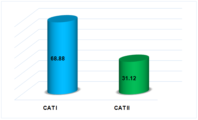 The body weight of about 86.6 % of the patients was less than 50 kg and13.4% of patients was greater than 50 kg. No statistically significant difference in body weight was found between diabetic and non-diabetic patients (P=0.5440). About 51.12% of the patients were smokers and 48.88% were non-smokers. The most commonly prescribed concomitant medications were ranitidine and aluminum hydroxide (36%). The other co-medications prescribed were insulin (34%), paracetamol (18%), theophylline (4%) and supplements (8%). The distribution of study participants based on the RNTCP (revised national tuberculosis control program) treatment (CAT I and CAT II) they received is shown in fig. 2.