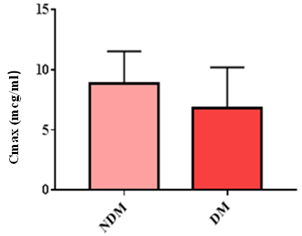 Results: The mean (Standard Deviation (SD)) age of the study population was 46.8 (14.2) years. The mean serum Cmax of rifampicin was significantly less in diabetic patients with pulmonary tuberculosis (p=0.0305). Statistically, a significant difference in the incidence of a decrease in Cmax was found between diabetic and non-diabetic patients (p=0.0335). Diabetes mellitus was found to be the predominant factor that affects rifampicin Cmax.