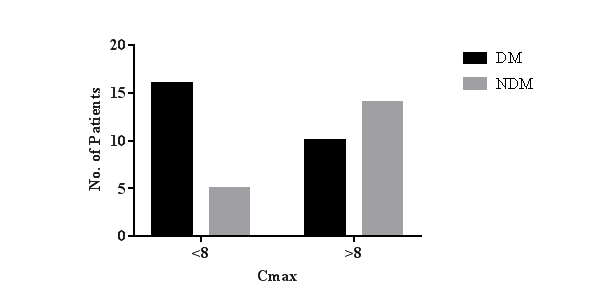 The mean serum Cmax of rifampicin was significantly less in diabetic patients with pulmonary tuberculosis (P=0.0305) as shown in fig. 3. Statistically, a significant difference in the incidence of a decrease in Cmax was found between diabetic and non-diabetic patients (P=0.0335) as depicted by fig. 4.