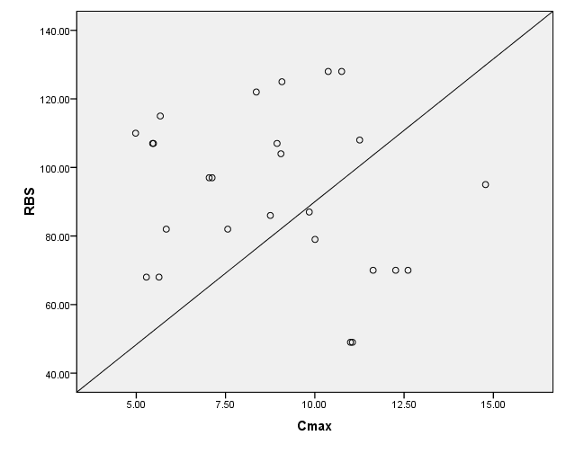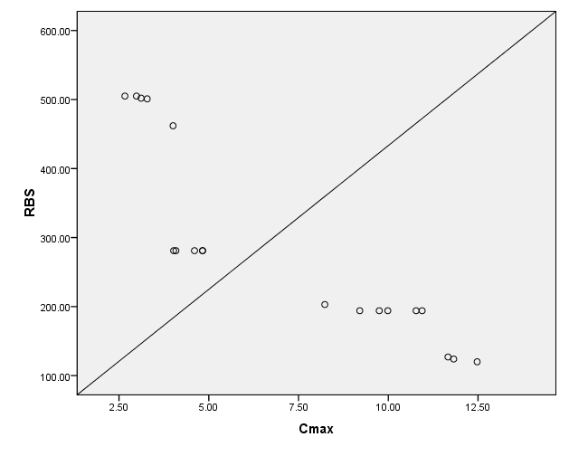 The values of RBS and observed Cmax of diabetic and non-diabetic patients with pulmonary tuberculosis were correlated using Pearson’s correlation. The correlation between RBS and rifampicin Cmax in pulmonary tuberculosis patients without diabetes is shown in fig. 5. The fig. 6 depicts the correlation between RBS and rifampicin Cmax in pulmonary tuberculosis patients with diabetes.