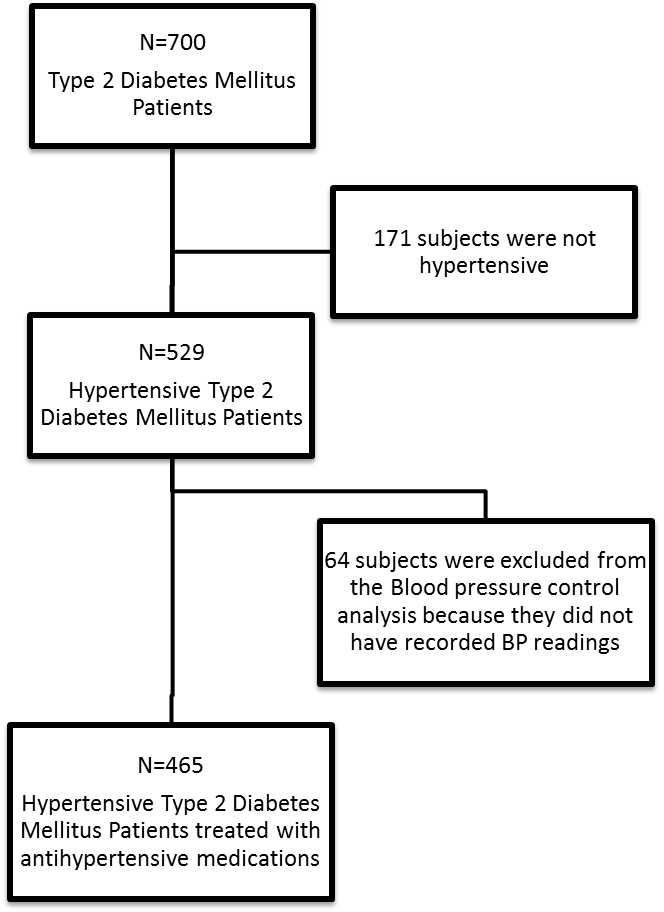 Moreover, of the hypertensive group, 64 hypertensive patients had no documentation of their BP readings and were therefore excluded from BP control analysis. The final sample consisted of 465 hypertensive patients (fig. 1).