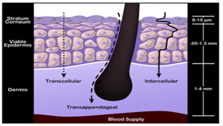 Topical drugs permeate into the skin via three pathways, transcellular, intercellular (paracellular), and trans appendageal (fig. 1) [12]. The transcellular route involves sequential partitioning of the drug in the cell and intercellular lipids while it traverses down through the skin layers. The intercellular route involves the movement of drug molecules through the lipid pathways between cells, while the trans-appendageal pathways involve the movement of molecules through skin appendages such as hair follicles and sweat glands.