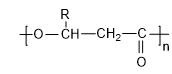 Fig. 2: The chemical structure of polyhydroxyalkanoate (PHA). Asterisk denotes the chiral centre of the PHA-building block. The nomenclature for PHA compounds is determined by the functional alkyl R group