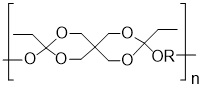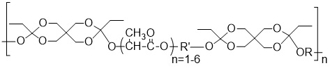 POE II (fig. 6) is produced from the reaction of diols with diketene acetal 3, 9-bis (ethylidene2,4,8,10-tetraoxaspirol[5,5] undecane). The autocatalytic effect of POE I is absent in POE II and its degradation products are neutral molecules. The degradation rate of the polymer may be modulated by adding acid excipients such as itaconic and adipic acids.