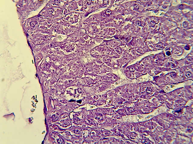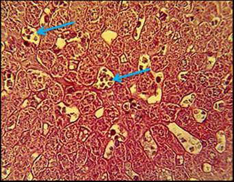 In other animals, fibrosis around multiple hepatic masses consisting from necrotic and apoptotic hepatocytes with the proliferation of certain hepatocyte (fig. 7).