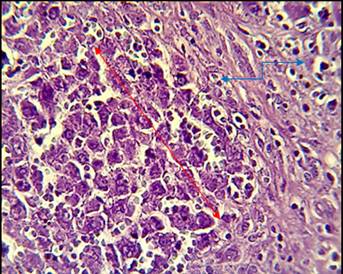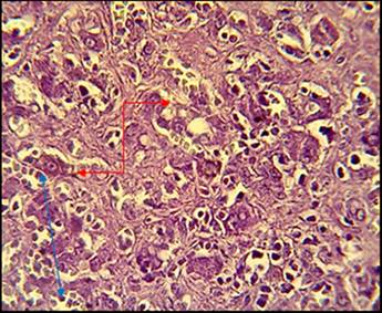 Fig. 2: Histopathological section in liver of animal administration with cholesterol showed marked proliferation of fibrous connective tissue infiltrated with mononuclear cells around isolated mass of proliferation of hepatocytes without central vein (blue arrow), from pseudolobules (red arrow), (H and E stain 40X)