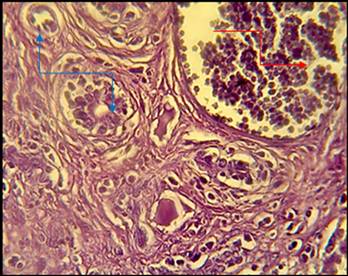 Fig. 4: Histopathological section in liver of animal administration with cholesterol showed marked fibrosis in portal area around proliferation of bile ducts (blue arrow) and congested portal blood vessels (red arrow) with proteinous material in lumen of bile ducts (H and E stain 40X)