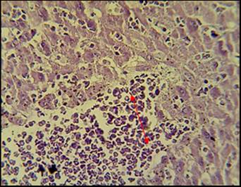 Results: Marked proliferation of fibrous connective tissue infiltrated with mononuclear cells was recorded; congested dilated of sinusoids and fibrosis in the portal area around the proliferation of bile ducts and congested portal blood vessels with the proteinous material in the lumen of bile ducts were also recorded. In other sections, the liver showed large necrotic area replacement with RBCs as well as enlarged foamy hepatocytes with mononuclear cells in narrowing sinusoids were seen.
