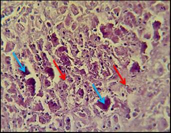 Fig. 7: Histopathological section in liver of animal administration with cholesterol showed fibrosis around multiple hepatic masses (red arrows) consisting from necrotic and apoptotic hepatocytes (blue arrows) with proliferation of certain hepatocytes (H and E stain 40X)