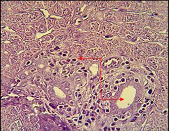 Furthermore, marked fibrosis in the portal area was found around the proliferation of bile ducts and congested portal blood vessels with the proteinous material in the lumen of bile ducts (fig. 4).
