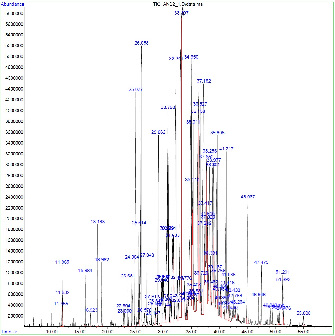 Fig. 2: GC-MS chromatogram of A. krisagathra leaves in the monsoon period