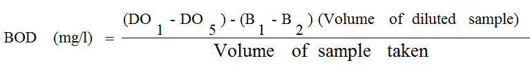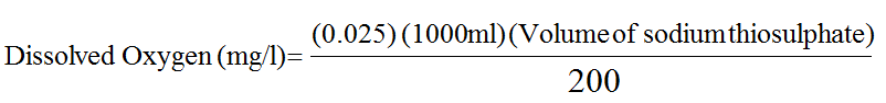 The samples were collected in BOD bottles, to which 2 ml of manganous sulphate and 2 ml of potassium iodide were added and sealed. This was mixed well and the precipitate was allowed to settle down. At this stage 2 ml of concentrated sulphuric acid was added, and mixed well until all the precipitate got dissolved. The sample (203 ml) was measured into conical flask and titrated against 0.025 N sodium thiosulphate using starch as an indicator. The end point was the change of colour from blue to colourless. The reduction in dissolved oxygen concentration during the incubation period yields a measure of the biological oxygen demand [27].