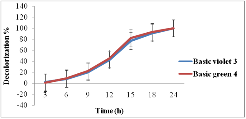 Fig. 1 shows the decolourization of dyes under shaking condition by growing Staphylococcus aureus. The bacteria took 24 h for 100 % decolourization of tested dyes. Fig. 2 shows the growth pattern of Staphylococcus aureus in presence of triphenylmethane dyes. The growth pattern of Staphylococcus aureus was slightly different from those of control and the lag phase delayed upto 6 h for both the dyes. The specific growth rate was found maximum (0.132 h-1) in absence of dyes. Growth rate was lower (0.127 h-1) in presence of basic violet 3 as compared to basic green 4 (0.130 h-1).