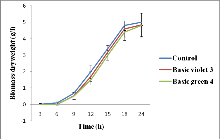 The beginning of the exponential growth phase of bacteria coincided with the onset of decolourization of dyes. It was also observed that the decolourization was faster during exponential growth phase of bacteria and slowed down in the stationary phase. Thus, it was evident from the present study that the decolourization of dyes by basic violet 3 and basic green 4 bacteria was dependent on cell biomass and on actively growing cells.