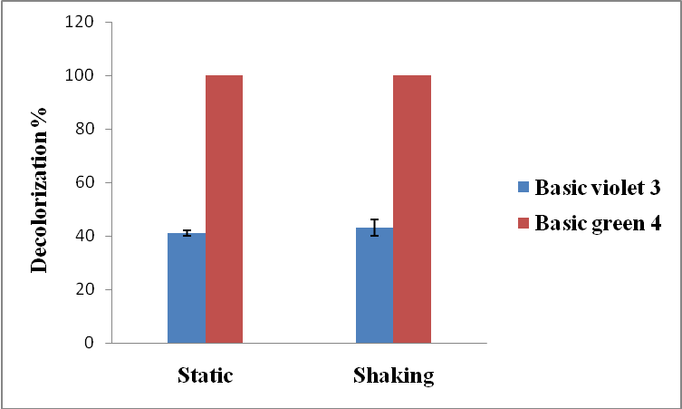 Fig. 3: Decolourization of dyes by Staphylococcus aureus under static and shaking condition. pH: 7; Initial dye concentration: 10 mg/l