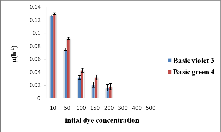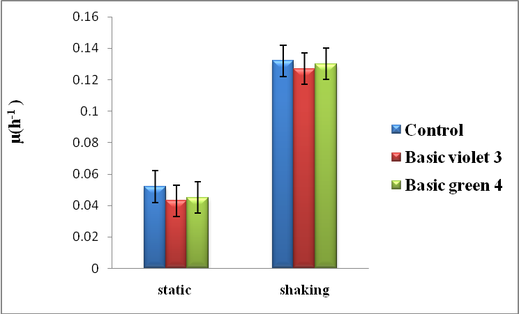 Fig. 4: Specific Growth rate of Staphylococcus aureus presence of basic violet 3 and basic green 4. pH: 7; Initial dye concentration: 10 mg/l