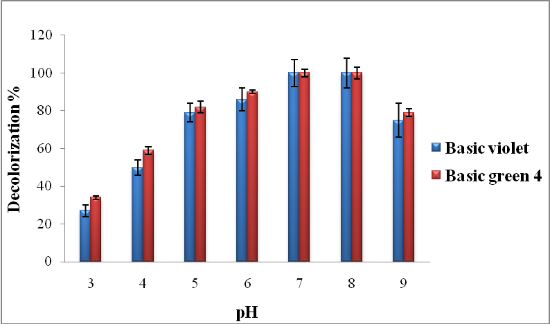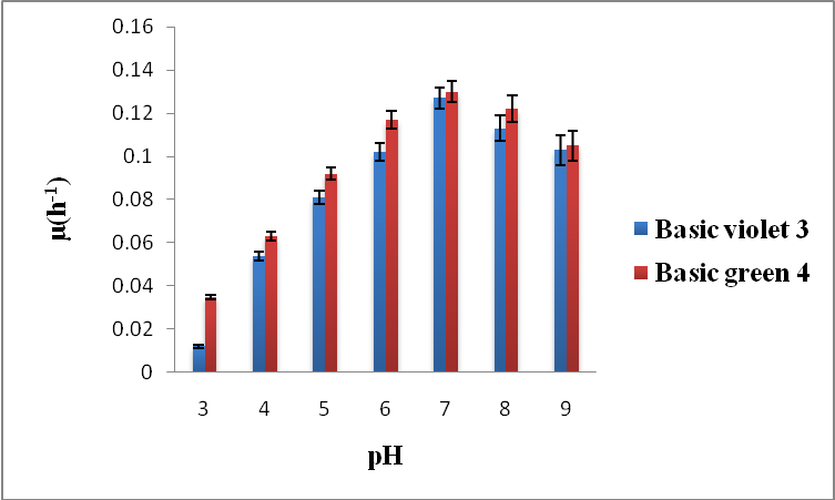 The effect of pH on the dye decolourization was given in the fig. 5. The dye decolourization was found to increase with increase in pH up to 8 and with further increase in pH the decolourization % decreased. The maximum dye decolourization was shown at pH 7 and 8. Fig. 6 shows the specific growth rate of Staphylococcus aureus in different pH condition. The highest specific growth rate of 0.127 h-1and 0.130 h-1was observed at pH 7 in presence of basic violet 3 and basic green 4 respectively. The results showed lower growth rate at acidic pH values.