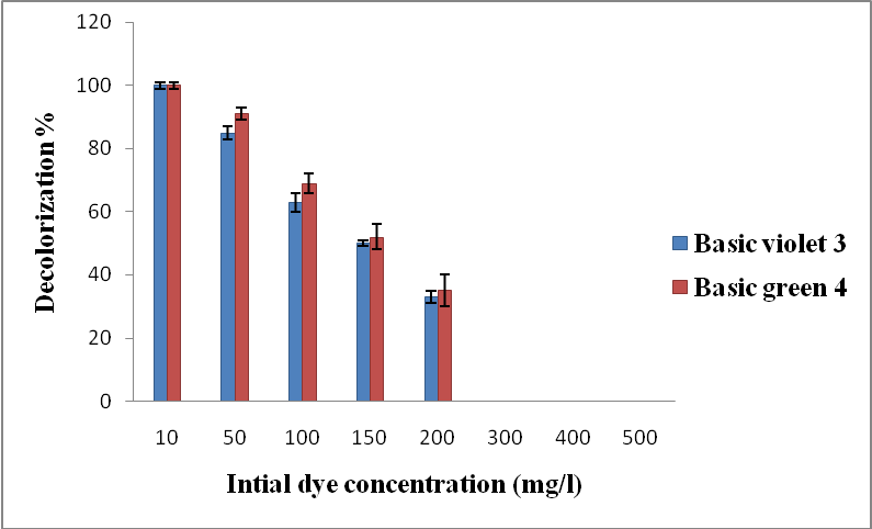 The percent decolourization of basic violet 3 and basic green 4 by Staphylococcus aureus was carried out at different dye concentrations from 10 mg/l to 500 mg/l. Fig. 7 Shows the effect of initial dye concentration on decolourization of dyes by Staphylococcus aureus. The results of our study showed that the bacteria could effectively decolorize basic violet 3 and basic green 4 with 100% decolourization at 10 mg/l concentration. With increasing initial dye concentration from 10 mg/l to 200 mg/l, the decolourization decreased considerably from 100% to 33 % for basic violet 3 and from 100% to 39% for basic green 4. This could be attributed to the toxicity of the dyes to the growing bacterial cells at higher dye concentration.