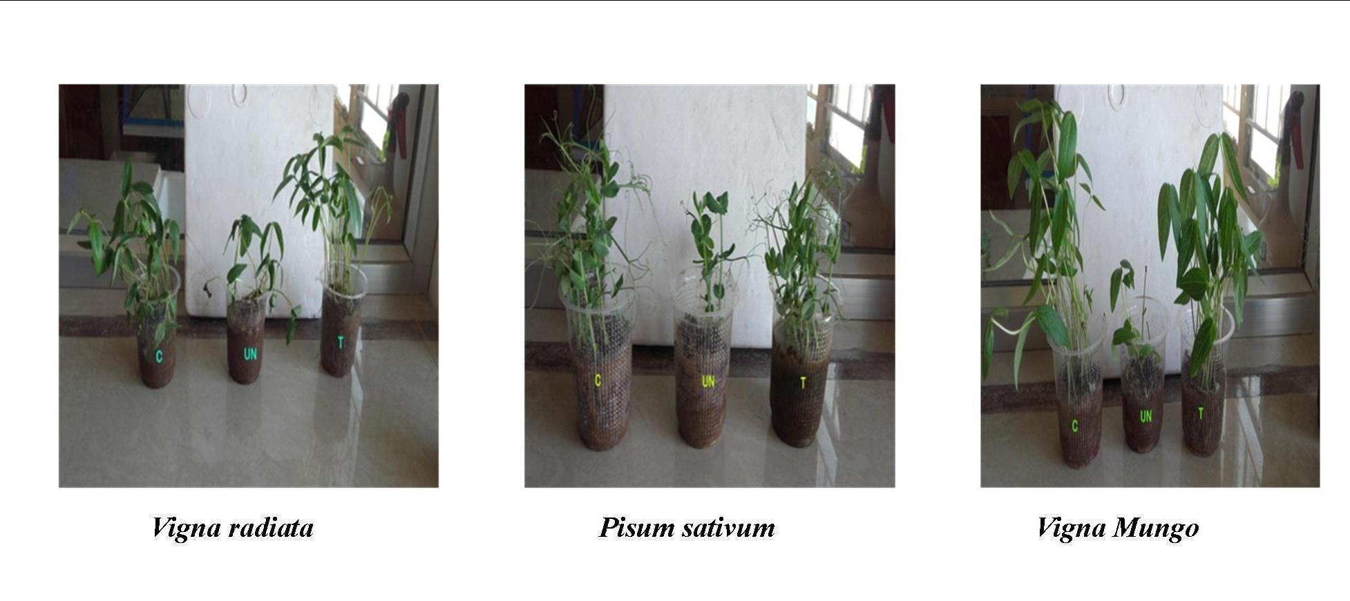 Phytotoxicity tests were performed in order to assess the toxicity of the real and treated leather dyeing effluent on plants. The phytotoxicity study was carried out on three kinds of seeds commonly used in the Indian agriculture Vigna mungo, Vigna radiate and Pisum sativum by watering 10 ml sample of real and treated leather dyeing effluent. Toxicity effect was measured in terms of percent germination and lengths of shoot and root after 7 d.