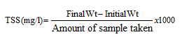 Total suspended solids are the portions of solids that usually retained on the filter paper. Suspended solid consists of silt, fine particles of organic and inorganic matter. For analysis, known amount of sample was filtered through the pre-weighed filter paper. The filter paper was dried at 103–105 °C. was determined by using the following formula [26],