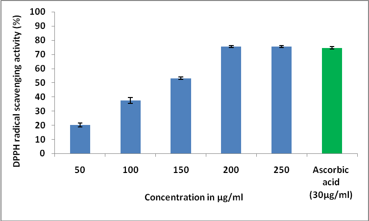 Fig. 1: DPPH radical scavenging activity of Euphorbia heterophylla L The Data was represented as Mean±SD. Experiment was done in triplicates n=3.