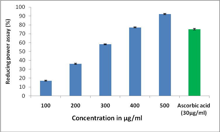 The antioxidant potential of the plant was indicated by reducing power assay. The presence of antioxidants in the plant extracts results in the reduction of the Fe3+/ferricyanide complex into its ferrous form which is measured by the intensity of the resultant Prussian blue color complex. The higher absorbance at high concentration indicates the strong reducing capacity. The reducing power of aqueous extract of Euphorbia hetrophylla L was very potent and the reducing power of plant was increased with increase in concentration which is showed in the Figure-2. The extract showed maximum activity of 92.12 % at its maximum concentration (500µg/ml) and compared to standard ascorbic acid. The IC50 value for reducing power was found to be 258.08µg/ml. Electron donating capacity of the plant extracts convert free radicals into more stable products and terminate the radical chain reaction [28]. Presence of the polyphenoic compounds in the plant extracts is responsible for the reducing power capacity [29].