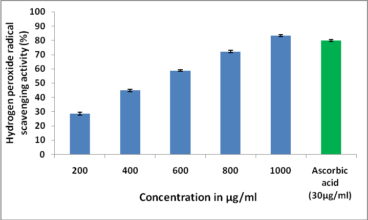 Fig. 3: Hydrogen peroxide radical scavenging activity of Euphorbia heterophylla L. The Data was represented as Mean±SD. Experiment was done in triplicates n=3.