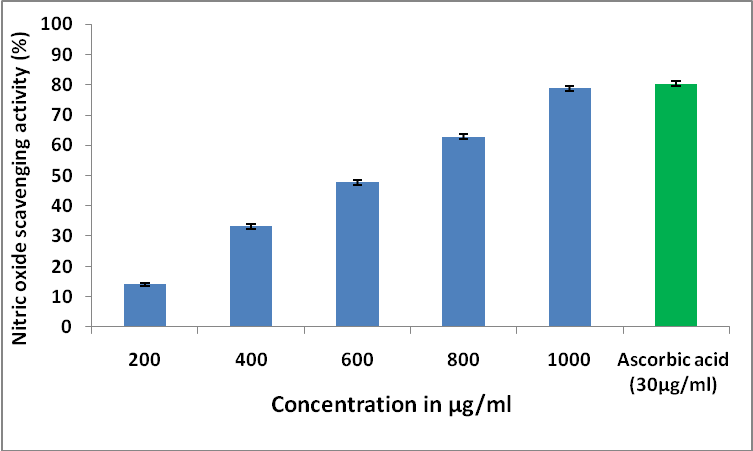 Fig. 4: Nitric oxide scavenging activity of Euphorbia heterophylla L. The Data was represented as Mean±SD. Experiment was done in triplicates n=3.