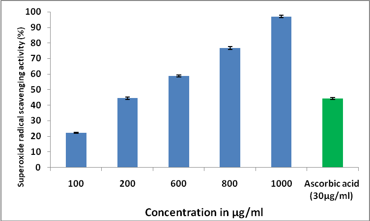 Fig. 5: Superoxide radical scavenging activity of Euphorbia heterophylla L. The Data was represented as Mean±SD. Experiment was done in triplicates n=3.
