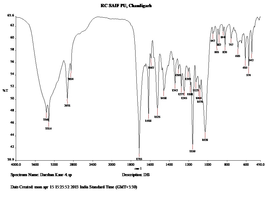The physical mixture of drug containing polymer and β – CD was shown to have peaks at 3316 due to N-H stretching, 2931 due to C-H (aromatic) stretching, 1525 due to C=C stretching, 1715 due to C=O stretching, 1159 due to S=O stretching, 1342 due to C-N (amines) stretching, 1028 due to C-O stretching and at 685 die to C-Cl stretching which are characteristics of Glibenclamide (fig 1).