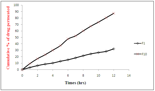 Fig. 5: Comparison of cumulative % of drug permeated from formulation F1 having no permeation enhancer and optimized formulation F10.