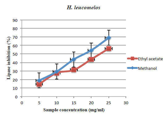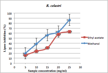 Results: With the increase in the concentration of extracts the higher inhibition of the enzyme was observed. Solvent methanol showed good activity compared to ethyl acetate. Percentage of inhibition ranged from 19.7-69.8 and 20.0-86.6 % in the methanol extract of Heterodermia leucomelos and Ramalina celastri respectively. Comparatively lichen Ramalina celastri in methanol extract showed maximum inhibition of 86.6 %, whereas ethyl acetate showed an inhibition of 63.0% at 25 mg/ml against enzyme lipase.