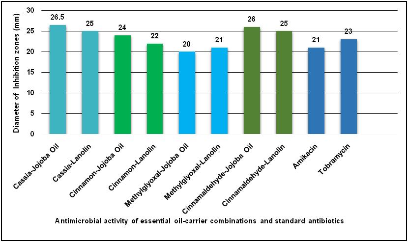 Fig. 1: Mean diameter of zone of inhibition (mm) of 80% essential oil with 20% carrier oil with and standard antibiotics
