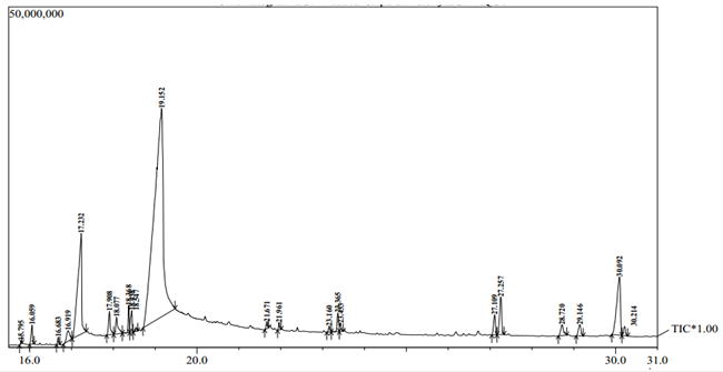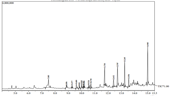Fig. 1: It shows GC-MS chromatograms of L. glutinosa stem bark essential oil