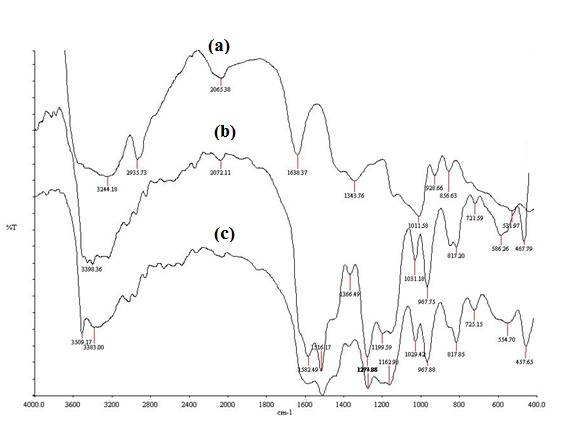 Fig. 1: FTIR spectra of (a) nanostarch, (b) curcumin loaded on nanostarch and (c) pure curcumin