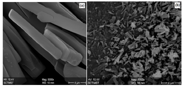 Fig. 2: SEM images of (a) pure curcumin and (b) curcumin loaded on nanostarch