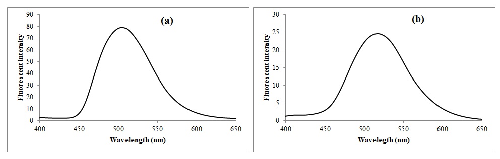 Fig. 3: Emission spectra of (a) curcumin loaded on nanostarch and (b) pure curcumin