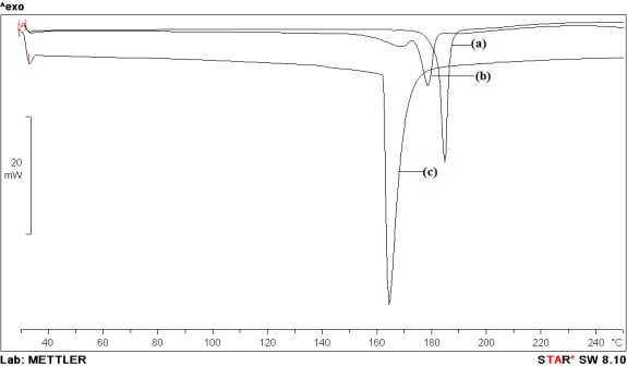 Fig. 5: DSC melting curves of (a) pure curcumin, (b) curcumin incorporated nanostarch and (c) nanostarch