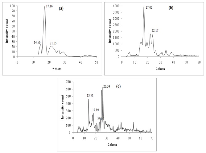 Fig. 6: X-ray diffraction patterns of (a) pure curcumin, (b) nanostarch and (c) curcumin incorporated nanostarch