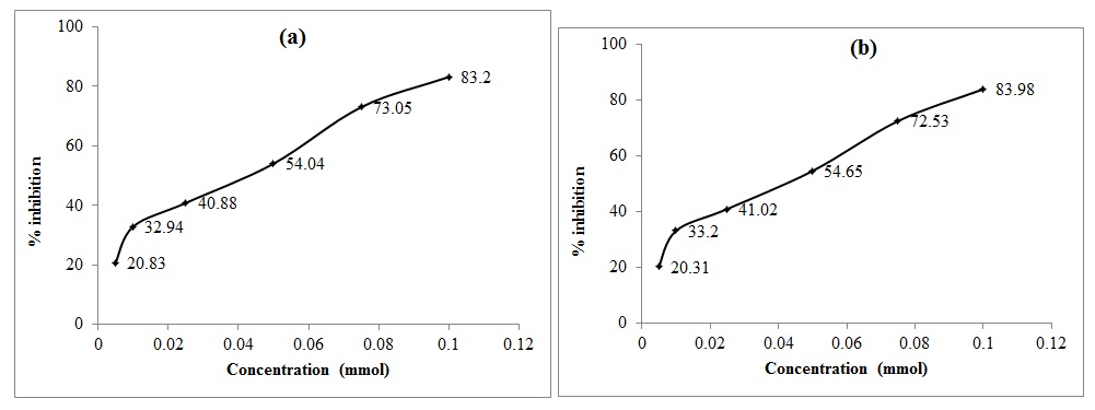 Fig. 7: Percentage inhibition of DPPH (10-2 mmol) at various concentrations of (a) curcumin and (b) nanostarch loaded curcumin