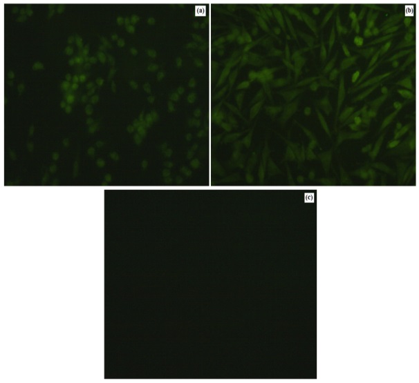Fig. 8: Fluorescence images of L929 cell lines at 24h of incubation with (a) pure curcumin, (b) curcumin incorporated nanostarch and (c) untreated cells