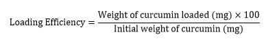 The filtrate was collected and the curcumin present in it was quantified spectrophotometrically. From the free curcumin available in the supernatant, the entrapped curcumin was calculated and was expressed as loading efficiency.