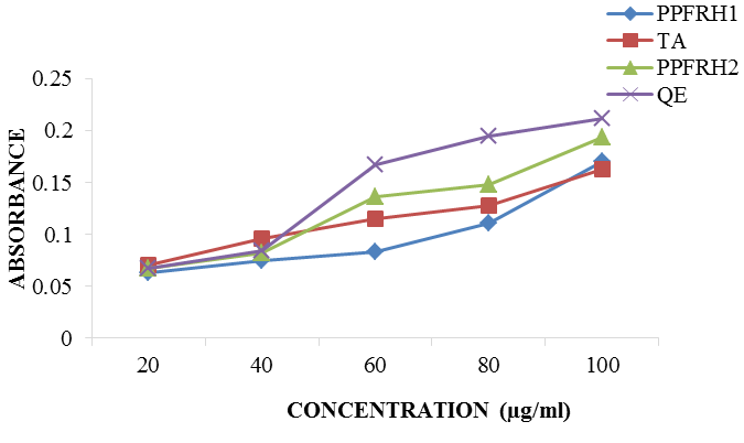 The results were determined from the regression equation of the calibration curve (A= 10.97 B-0.4098, R2 = 0.998) as quercetin equivalents in milligram per gram of extract (mg QAE/g extract). This quantitative assay demonstrated that PPFRH contained the highest amount of total phenolics (0.170 μg TAE/mg fraction) and total flavonoids (0.193 μg QAE/mg fraction), suggesting that PPFRH is a polyphenol enhanced fraction as shown in the (fig. 1).