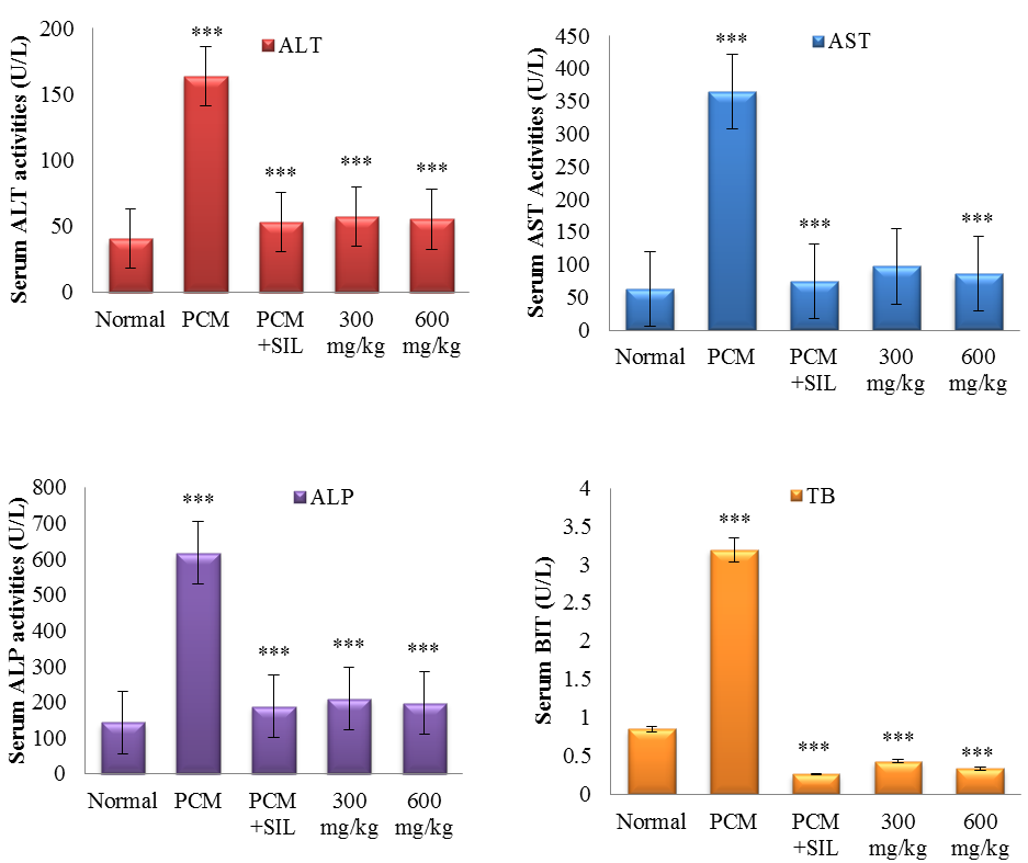 Fig. 3: Effects of PPFERH on serum ALT, AST, ALP and TB. Rats were administrated paracetamol with PPFERH at 300, and 600 mg/kg body weight once daily for 4 consecutive days prior to the single administration of paracetamol (1%). Values are expressed as means±SD of 6 rats in each group. ***p<0.001, as compared to the paracetamol intoxicated group