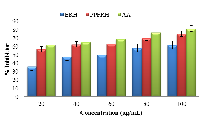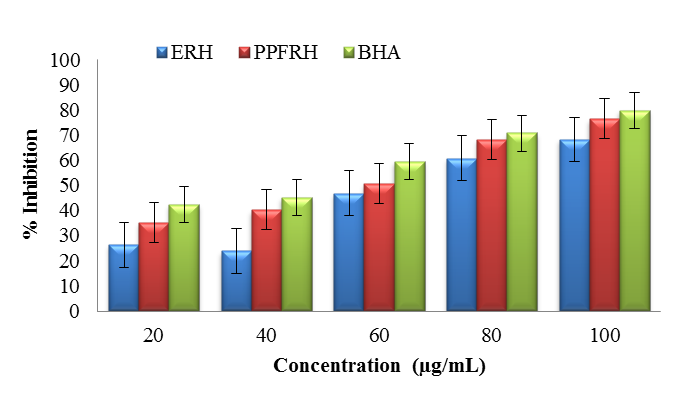 Fig. 5 shown in the hydroxyl radical scavenging activity of PPFRH was dose dependent. The fraction, PPFRH is higher activity than that of the crude extract (ERH). At a concentration of 100 mg/ml, the scavenging activity of ERH and PPFRH was found to be 68.36% and 76.5%, respectively, whereas, at the same concentration, the standard BHA was 79.79%. The demonstrating inhibitory effect of hydroxyl radical scavenging activity of standard BHA is higher than that of PPFRH.